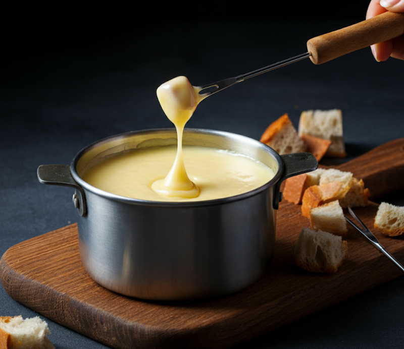 Añade el vino seco o kirsch, mezcla nuevamente y coloca la fondue de cuatro quesos sobre el calentador.