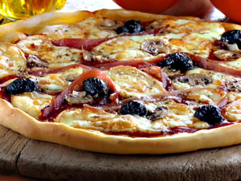 Corta el queso raclette Le Rustique en lonchas, dispón los trozos de raclette de manera cuidada sobre la pizza y luego añade el resto de los champiñones laminados, el jamón curado cortado en tiras y las aceitunas negras.